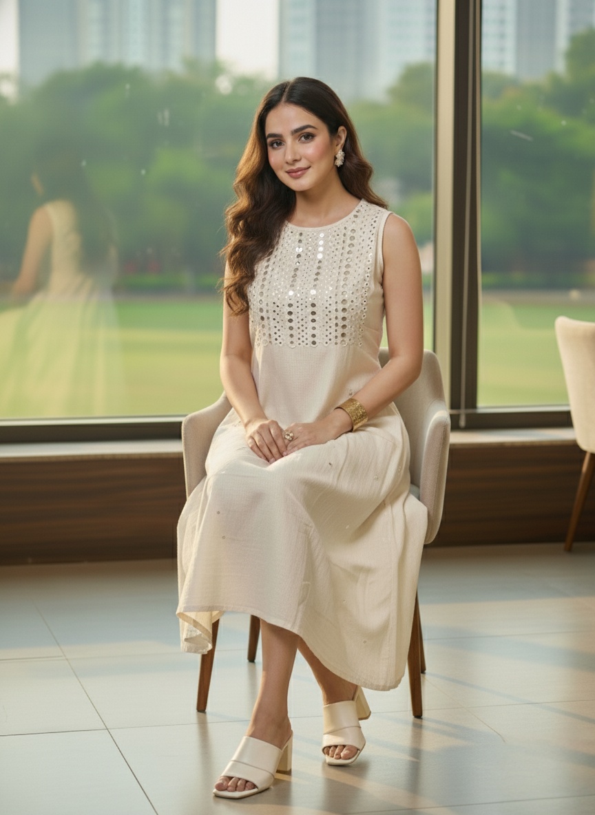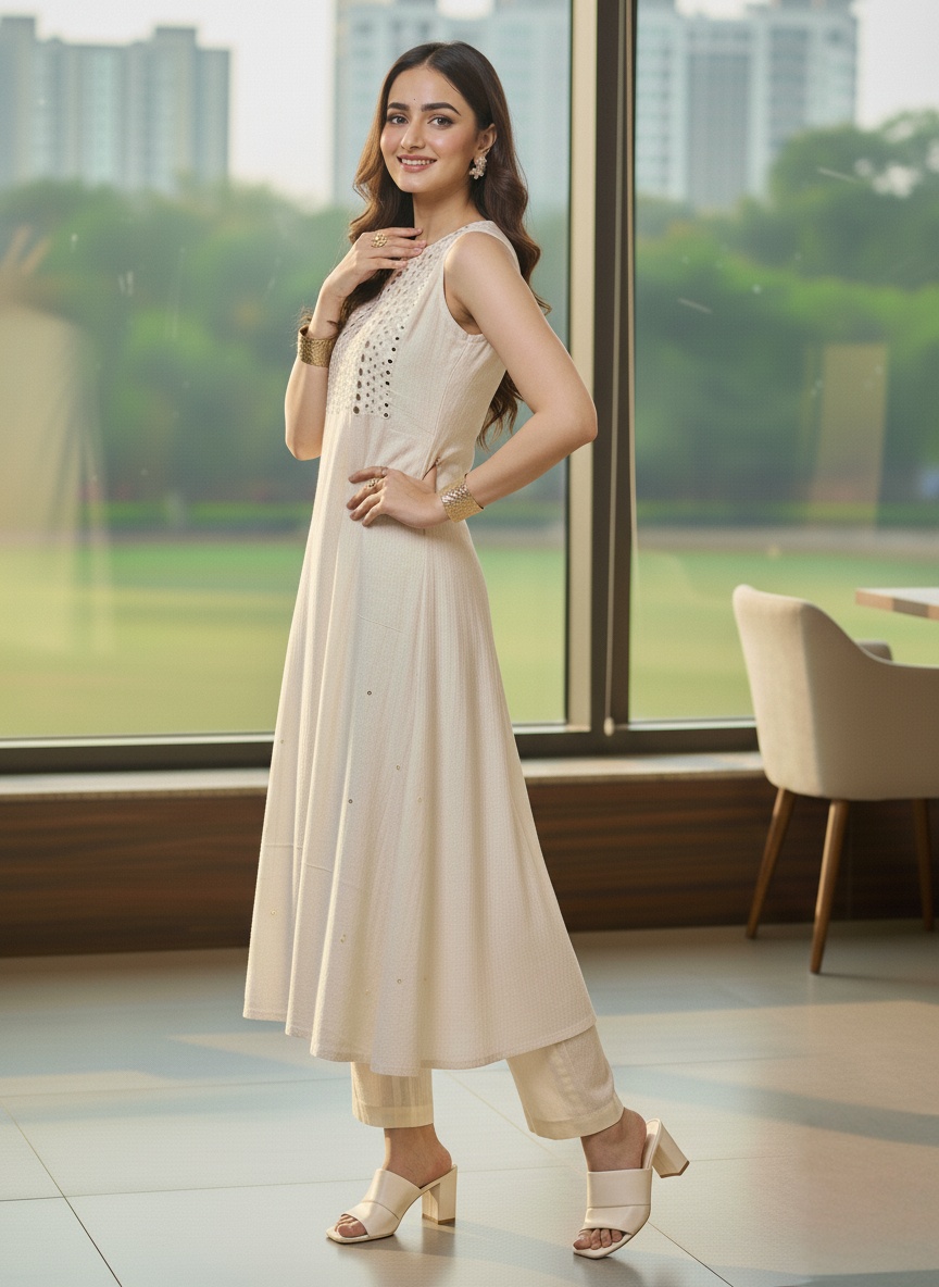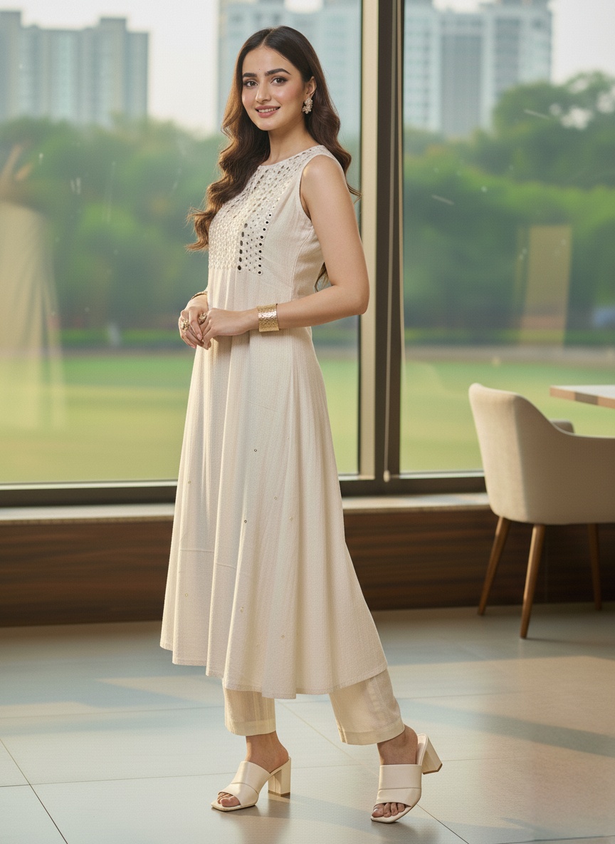 This exquisite co-ord set features a sophisticated and contemporary take on traditional Indian mirror work, known as ‘Abla’ or ‘Shisha’ work. The overall look is effortlessly graceful, suitable for semi-formal gatherings, festive occasions, or stylish daytime events. , while the dazzling mirror embellishments, concentrated on the yoke, transform it from a simple day outfit into a radiant ensemble perfect for festive luncheons or semi-formal evenings for the effortless ethnic glamour that shines without being overpowering.