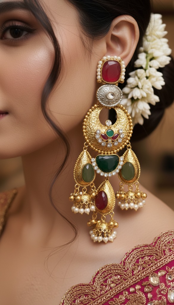 Design: A grand, multi-tiered drop design featuring an ornate Chandbali (crescent moon) motif as the central element.