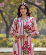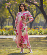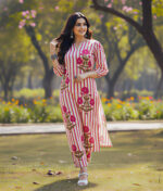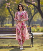 Adorned with a unique combination of stripes & delicate floral prints, this set adds a refreshing charm to your ethnic wear collection.