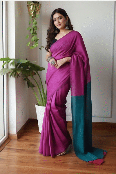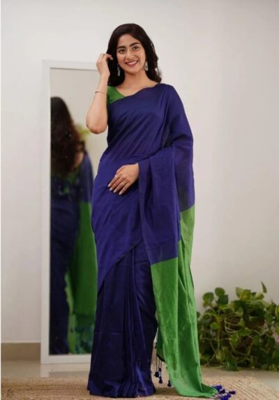 This Khadi Cotton Saree with Contrast Blouse is a blend of comfort and elegance. Crafted from premium khadi cotton, it ensures breathability and durability, making it ideal for all-day wear. The contrast blouse (same as the pallu) adds a modern touch while maintaining the sareeβs traditional appeal.