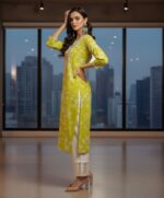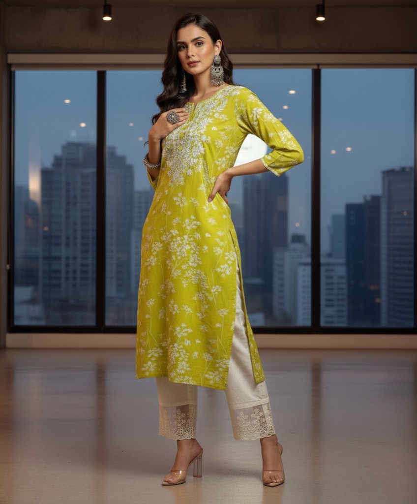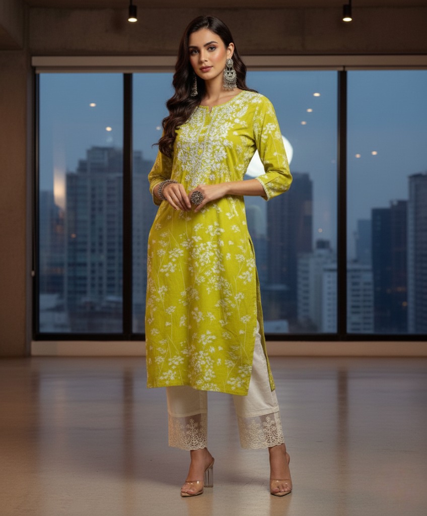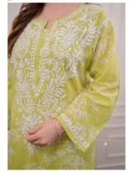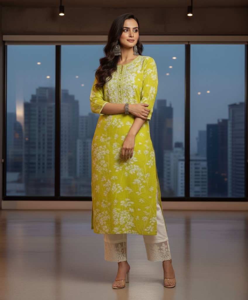 • Kurta: The bright lime green mul kurta has intricate white embroidery, likely chikankariΒ (a traditional Lucknowi needlework), concentrated around the yoke and neckline, with a complementary floral print extending down the body. It features stylishΒ three-quarter sleevesΒ with a gentle flare or bell shape at the cuff.