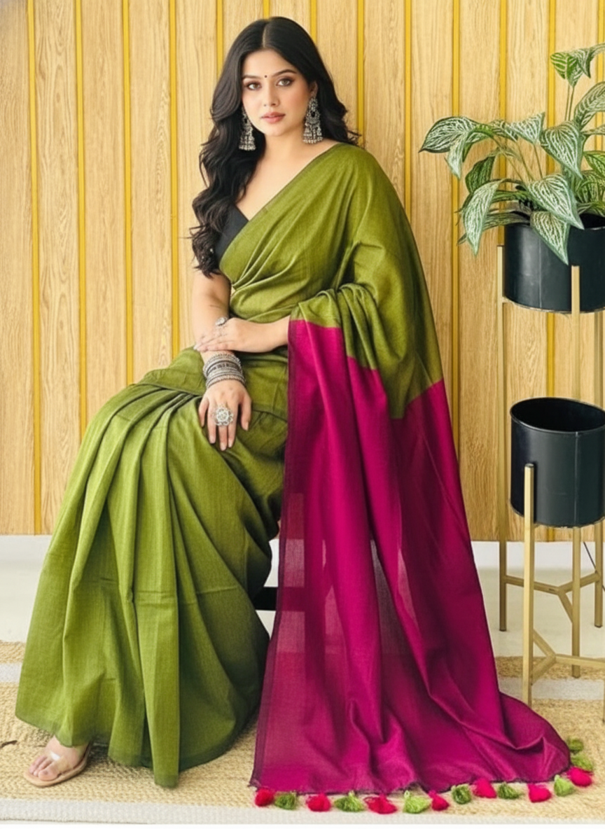 This Khadi Cotton Saree with Contrast Blouse is a blend of comfort and elegance. Crafted from premium khadi cotton, it ensures breathability and durability, making it ideal for all-day wear. The contrast blouse (same as the pallu) adds a modern touch while maintaining the saree’s traditional appeal.