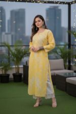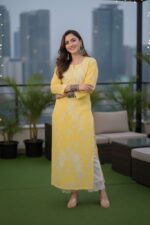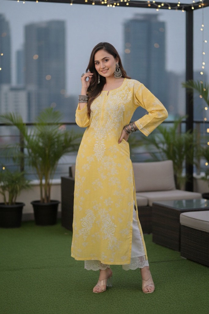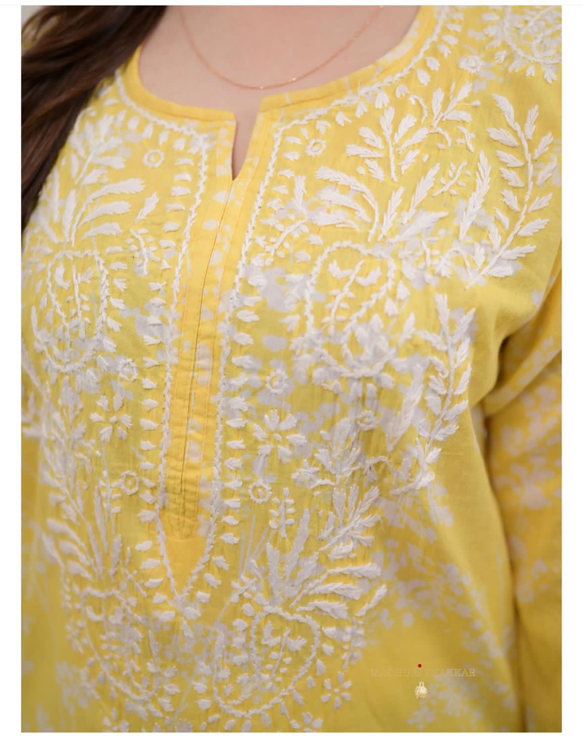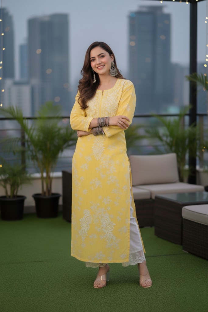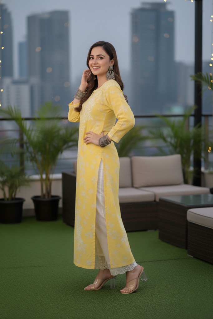 - Kurta: The bright Yellow mul kurta has intricate white embroidery, likely chikankariΒ (a traditional Lucknowi needlework), concentrated around the yoke and neckline, with a complementary floral print extending down the body. It features stylishΒ three-quarter sleevesΒ with a gentle flare or bell shape at the cuff.